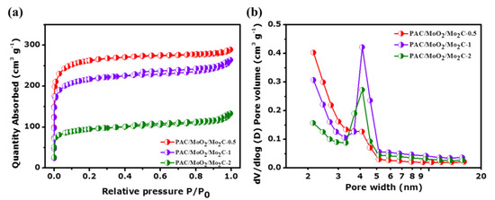 N2 adsorption/desorption experiment was conducted to investigate the textural properties of the PAC/MoO2/Mo2C ternary composites as shown in Figure 6 and Table 2. Figure 6a,b presents the sorption isotherms and the pore size distribution curves, respectively, of the ternary composites. All isotherms depicted a type IV features associated with a H4 hysteresis loop which indicates the coexistence of the micropores and mesopores structures in the ternary composites [55,56]. The BET specific surface area (SSA) values of PAC/MoO2/Mo2C-0.5, PAC/MoO2/Mo2C-1 and PAC/MoO2/Mo2C-2 samples are 804, 711 and 301 m2 g−1, respectively. A decrease in SSA was observed upon increasing the ammonium molybdate precursor loading from 0.5 to 2. For the total pore volume and micropore area (Table 2), the same trend is also identified for all samples from with the decrease from 0.44 to 0.20 cm3 g−1 and 670 to 165 m2 g−1, respectively.