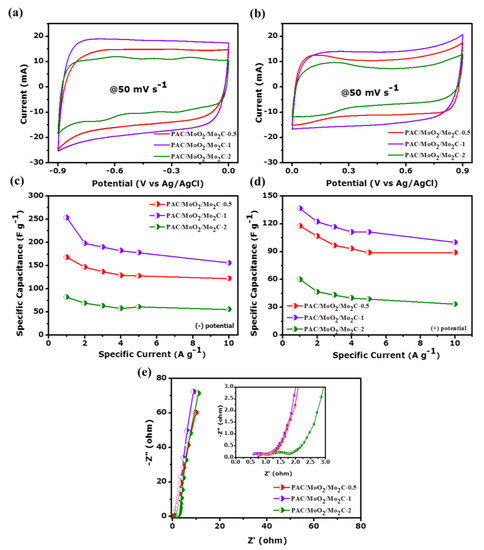 (a,b) Cyclic voltammetry at scan rate of 50 mV s−1, (c,d) specific capacitance at different specific current values in (−0.9–0.0 V) and (0.0–0.9 V) operating potential windows and (e) Nyquist plots of the PAC/MoO2/Mo2C ternary composites in a three-electrode configuration.