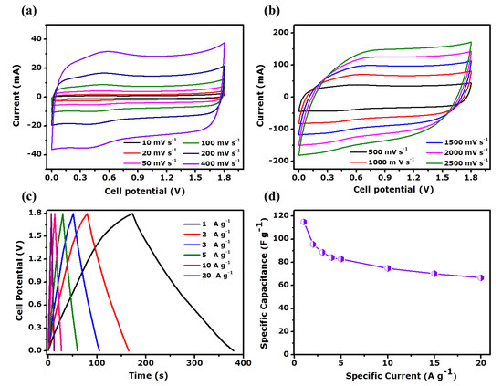 (a,b) Cyclic voltammetry at scan rates variant from 10–400 mV s−1 and from 500–2500 mV s−1, respectively, (c) galvanostatic charge-discharge profiles at various specific currents from 1 to 20 A g−1 and (d) specific capacitance as a function of specific current for PAC/MoO2/Mo2C-1//PAC/MoO2/Mo2C-1 symmetric cell.