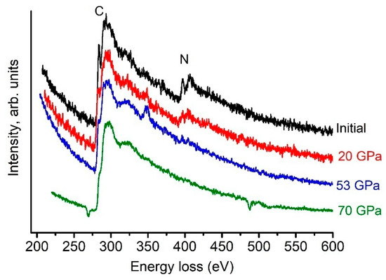 Three different types of nonoxidized N atoms can be found in C-N materials [23]: (a) “pyridinic”, (b) “pyrrolic”, and (c) “graphitic” nitrogen, with binding energies of ≈399.0, ≈400.3, and ≈401–403 eV, respectively. As follows from the EELS spectra (Figure 6), “graphitic” nitrogen is detected in the C-N phases before and after shear deformation. The presence of strong C-K and N-K π* peaks indicates that the starting g-C3N4 phase is preferentially sp2 bonded [24,25]. To estimate the concentration of sp2 bonds in the carbon phase, we used the method described in [26]; the results are shown in Table 2. A detailed review of the methods developed for treating the EEELs spectra of carbon can be found elsewhere [27].