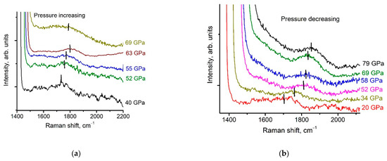 Strong fluorescence makes it difficult to measure the Raman spectra of the C-N phases at low pressures [28]. However, abroad band on the Raman spectra can be detected at pressures above 40 GPa. It is centered at 1730 cm−1 at 40 GPa (Figure 7a). We assume that the position of this peak coincides with the 1620 cm−1peak at an ambient pressure measured in [28] using UV laser. The position of the 1620 cm−1peak as the function of pressure is shown in Figure 8. The peak positions were found using OriginPro 8 (OriginLab Corporation) tools (OriginLab Corporation, One Roundhouse Plaza, Suite 303, Northampton, MA 01060, United States). The positions are marked in Figure 7. Errors correspond to the symbol size in Figure 8.