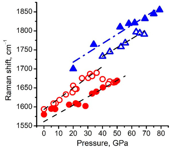 Apparently, the partial transformation of sp3to sp2 bonds at ~15 GPa during unloading, causes a “jump” in Raman frequency with one linear dependency (1560 cm−1 at 0 GPa) to another (1590 cm−1 at 0 GPa) (Figure 7). After the pressure releases, 50% of the sp3 bonds remain in the samples, according to XPS data [30]. In the Raman spectra, along with the D and G peaks (sp2 bonds), there is a 1560 cm−1 band (sp3 bonds). A similar transition of sp2 to sp3 hybridization at pressures above 15–20 GPa, and a partial reverse transition when the pressure is released, were also observed in other carbon materials [35,36,37,38,39].
