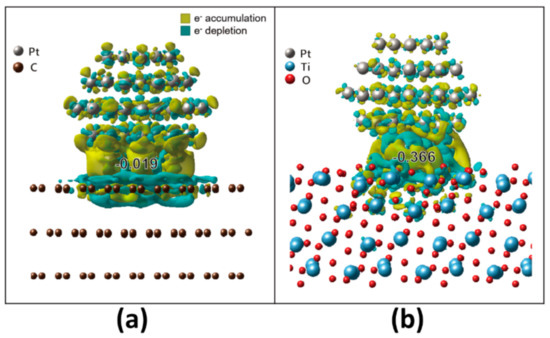 Our results clearly indicate that MPTO is much better for enhancing the Pt NP stability than graphite support. Since the SMSI plays a crucial role in the catalytic activity and stability of Pt NP, we calculated electronic structures of our model systems to elucidate the SMSI mechanism [44,45,46,47,48,49,50], which plays an imperative role in both the catalytic activity and the stability. To understand the origin of the electronic structural change, Bader change analysis [51] was evaluated for Pt/MPTO and Pt/graphite. The differences in the charge density were defined as follows Equation (2):