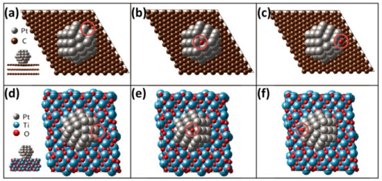 Top view of (a–c) Pt55/graphite and (d–f) Pt55/MPTO where O is adsorbed at top, side and bottom on the FCC sites of Pt nanoparticle, as indicated by circles.