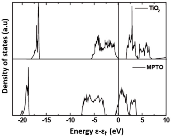 The density of states (DOS) was investigated to obtain an insight from electronic structures of TiO2 and MPTO materials as shown in Figure 7. It denotes that DOS of TiO2 features poor electrical conductivity as represented by the band gap of ca. 1.69 eV around the Fermi level, well agreeing with the previous literatures [70,71]_ENREF_6. To the contrary, MPTO has energy states for electrons around the Fermi level enabling electrical conductivity, which is critical to be good support material for the Pt catalyst to ORR. Since our experimental sample for MPTO material is composed of two mixed phases of TiO2 and MPTO as measured by XRD analysis, the electrical conductivity is lower than pure MPTO.