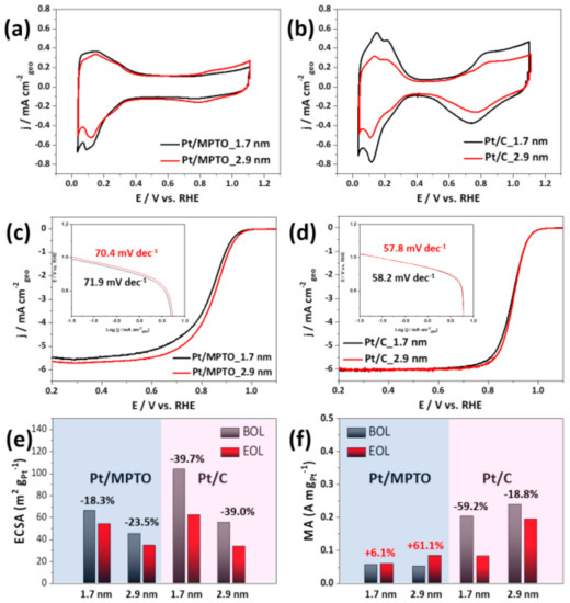 Figure 8a,b presents the CV curves of Pt/MPTO and Pt/C in N2-saturated 0.1 M HClO4 solution at room temperature. The ECSA of the catalysts was obtained by calculating the charge using the hydrogen adsorption-desorption area. The ECSA of samples are 66.3, 45.1 m2 g−1Pt for Pt/MPTO samples and 103.7, 55.4 m2 g−1Pt for Pt/C samples, respectively. The calculated initial ECSA of Pt/MPTO samples is relatively low than Pt/C regardless of particle size. It is due to the low electrical conductivity of MPTO and is consistent with the results reported in previous literature [13,72,73]. The linear sweep voltammograms (LSVs) on Pt/MPTO and Pt/C, recorded in the anodic sweep mode in an O2-saturated 0.1 M HClO4 solution at 1600 rpm. As shown in Figure 8c,d, the half-wave potential (E1/2) of samples is slightly shifted to higher potential as an increase of particle size, indicating the improved ORR activity. As the particle size increases from 1.7 nm to 2.9 nm, the reduced oxophilicity of Pt on MPTO and carbon leads to an increase in ORR performance through the blocking of oxygen species (OH) on active sites [74]. In addition, in the literature, it is well-known that the optimal particle size for ORR is nearly 3.5 nm [75]. Moreover, compared to Pt/C, we confirmed the suppression of Pt-OH formation, which is considered to be due to changes in the electronic structure of Pt by MPTO.