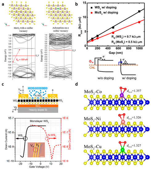 - McDonnell, S.; Addou, R.; Buie, C.; Wallace, R.M.; Hinkle, C.L. Defect-dominated doping and contact resistance in MoS2. ACS Nano 2014, 8, 2880–2888. [Google Scholar] [CrossRef]
