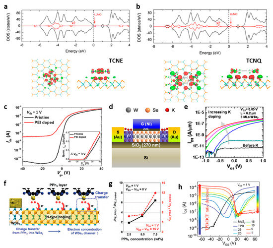 - Du, Y.; Liu, H.; Neal, A.T.; Si, M.; Peide, D.Y. Molecular Doping of Multilayer MOS2 Field-Effect Transistors: Reduction in Sheet and Contact Resistances. IEEE Electron. Device Lett. 2013, 34, 1328–1330. [Google Scholar] [CrossRef]
