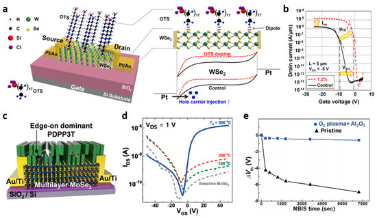 - Kang, D.-H.; Shim, J.; Jang, S.K.; Jeon, J.; Jeon, M.H.; Yeom, G.Y.; Jung, W.-S.; Jang, Y.H.; Lee, S.; Park, J.-H. Controllable nondegenerate p-type doping of tungsten diselenide by octadecyltrichlorosilane. ACS Nano 2015, 9, 1099–1107. [Google Scholar] [CrossRef] [PubMed]