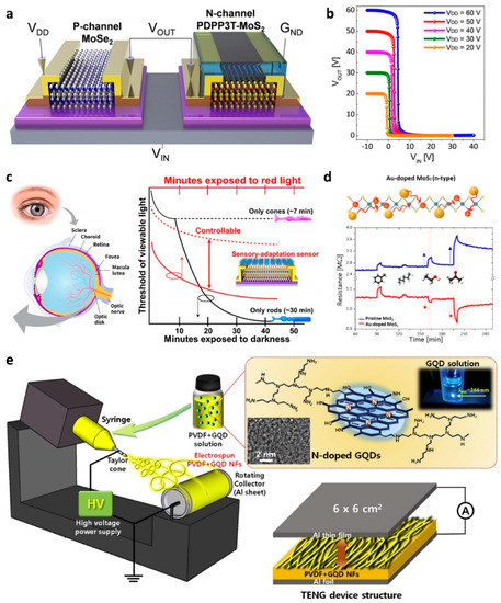 - Zhao, L.; Chen, K.; Yang, F.; Zheng, M.; Guo, J.; Gu, G.; Zhang, B.; Qin, H.; Cheng, G.; Du, Z. The novel transistor and photodetector of monolayer MoS2 based on surface-ionic-gate modulation powered by a triboelectric nanogenerator. Nano Energy 2019, 62, 38–45. [Google Scholar] [CrossRef]