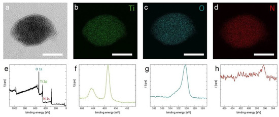 (a–d) EELS mapping of a TiON nanoparticle. (a) TEM image of the analyzed particle. (b–d) Elemental mapping of titanium, oxygen, and nitrogen, respectively; (e–h) XPS spectra of the synthesized TiON nanoparticles. Image (e) shows a full scan; images (f–h) show the spectra regions of Ti 2p, O 1s, and N 1s, respectively. The scale bars in (a–d) = 40 nm.