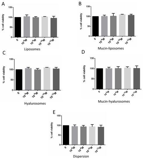 The mean diameter of the vesicles was measured by dynamic laser light scattering (Table 2). Liposomes and mucin-liposomes were the smallest vesicles (~105 nm, p > 0.05 between the values of the two samples), while the polydispersity index was always lower than 0.22, demonstrating a good homogeneity of the system. Hyalurosomes and mucin-hyalurosomes were slightly larger than the corresponding liposomes (~129 nm, p > 0.05 between the values of the two samples). All the prepared vesicles were negatively charged (~−11 mV) and this parameter was not affected by the presence of polymers.