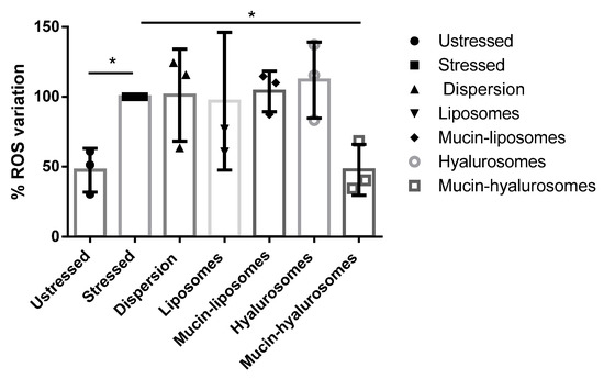 Previous studies have demonstrated that corticosteroids in dispersion or in solution are not capable of counteracting the increased production of ROS caused by cigarette smoke extract exposure in bronchial epithelial cells, but its loading in phospholipid vesicles seemed to be a promising strategy [28]. The efficacy of the different formulations in inhibiting the production of ROS induced by stressing bronchial epithelial cells with cigarette smoke extract has been assessed (Figure 4). Beclomethasone dipropionate was used at a concentration of 10−9 M because it was more effective on the basis of preliminary dose–response experiments (data not shown) and of a previous study [33]. The bronchial epithelial cells unstressed with cigarette smoke extract expressed a basal value of ROS ~47%, due the presence of endogenous species. The exposure of the cells to the cigarette smoke extract significantly increased ROS expression up to ~100% (p < 0.0003 versus unstressed cells). Beclomethasone dipropionate in dispersion or loaded in liposomes, mucin-liposomes or hyalurosomes was not able to counteract the ROS production caused by the cigarette smoke extract on epithelial bronchial cells. Indeed, the values were still ~100% (p > 0.05 versus ROS positive cells, stressed and untreated). However, beclomethasone dipropionate loaded mucin-hyalurosomes significantly reduced the ROS expression induced by cigarette smoke extract (p < 0.01 versus ROS positive cells, stressed and unstressed) reaching the same ROS value as the unstressed heath cells.
