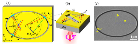 Bliokh et al. proposed a semicircular metallic slit as the focusing plasmonic nanostructure to demonstrate the OSHE []; this has overcome difficulties and inaccuracies in observing and measuring small shifts in large-sized light fields in the previous observations of the effect in reflection and refraction at medium interfaces. Thereafter, plasmonic curvilinear nanostructures have attracted great interest for investigating the characteristics of OSHE in different regimes. Until now, various curvilinear nanostructures, such as catenary slits [], plasmonic chains [], and PB phase metasurfaces [,,,,,,,,], have been used for applications. The key feature of nanostructures is their noncircular symmetry, which is usually achieved by truncating a closed curvilinear nanoslit in such a way that the spatially asymmetric shift of the spin-dependent light wavefield takes place in the direction perpendicular to the axis of reflection symmetry of the structure. In regimes of slit structures of closed curves with noncircular but reflection symmetry, the OSHE and the transverse shifts in the directions of the reflection axis may occur, and novel characteristics of the light field may be achieved correspondingly; however, they have rarely been studied in such structures.