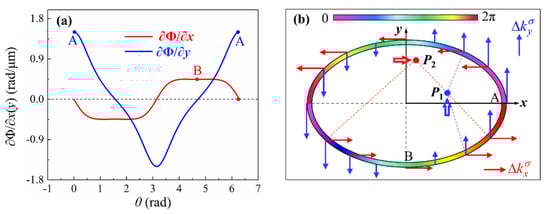 To comprehend the overall effect of the phase gradient ∇Φ on the shift of light intensity distributions and the characteristic spots, we plotted the curves of gradients ∂x Φ and ∂yΦ along the elliptical nanoslit as a function of azimuth θ in Figure 2a, which are calculated based on Equations (10a) and (10b). The basic characteristics of the curves for ∂xΦ and ∂yΦ are noticeable. In a comparatively large range of θ, the curve of ∂xΦ remains nearly negative and positive constant values in the intervals [0, π] and [π, 2π], respectively, corresponding to the upper and lower halves of the ellipse, respectively, with the corresponding momentum demonstrated by the red arrows on the ellipse in Figure 2b. The curve of ∂yΦ has positive and negative values in the intervals [–π/2, π/2] and [π/2, 3π/2], respectively, corresponding to the right and left halves of the ellipse, respectively; on both sides of the midpoint of each interval, the curve increases and decreases linearly symmetrically, and the momentum is indicated by the blue arrows in Figure 2b.
