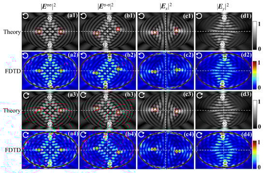 (a1–d4) Intensity maps of different components at the gold–air interface z = 0 obtained by finite-difference time domain (FDTD) simulation (rows 2 and 4) and numerical integral calculations based on Equations (6a)–(8b) (rows 1 and 3) for left-handed circular polarization (LCP) (rows 1 and 2) and right-handed circular polarization (RCP) (rows 3 and 4) illuminations. In the columns from left to right, the intensity maps are for the incident spin component, converted spin component (CSC), x-component, and y-component, respectively. The incidences are denoted by the white arrows.