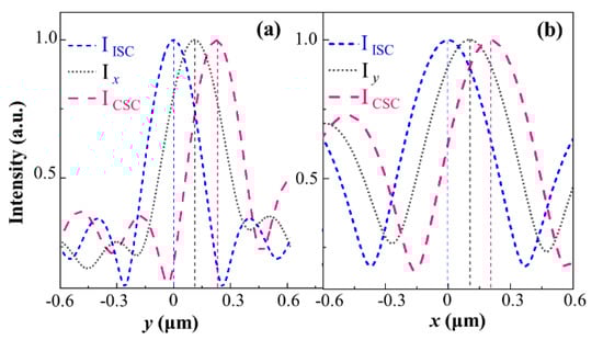 Obviously, the shifts between the characteristic spots in the x- and y-component fields are smaller than (actually half) those between the spots of the corresponding symmetric pair in the CSC field, as shown in Figure 3, with the spots in corresponding pairs marked with red and white circles, respectively, for clarity. This happens because the fields of the x- and y-component are the addition of the fields of corresponding component in both CSC and ISC, as noticed in Equations (8a) and (8b), and the shifts of spots occur solely in the CSC field, not in the ISC field. To analyze the shifts more quantitatively, the intensity curves through the centers of the characteristic bright spots were extracted from the images of the x- and y-component, together with the curves through the corresponding spots from CSC and ISC, respectively, are shown in Figure 4. The curves in Figure 4a designate the intensity data along the vertical lines, marked with the dashed green vertical line segments in Figure 2(a2–c2), while the curves in Figure 4b indicate the data along the horizontal lines, marked with the black segments in Figure 3(a2,b2,d2). For the curves in Figure 4a, the y-coordinates corresponding to the peaks of the intensity curves for the x-component and CSC are practically the spot shifts along the y-direction, referred to as y-shifts, which are read at 0.1098 µm and 0.2218 µm, respectively, under the parameter values set for the simulations; meanwhile, the peak at zero y-coordinate in the ISC intensity curve can be used as the reference for the shifts of the corresponding spots in the x-component and in the CSC fields.
