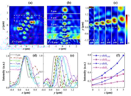 When the observation plane moves away from the sample surface with distance z, the OSHE is manifested as an increase in the characteristic spot shifts in the outgoing CSC component field, as described above. Figure 5a illustrates the full intensity image of the CSC fields obtained with FDTD at z = 3 μm, and Figure 5b presents the image consisting of striped intensity images, including the characteristic spots of the x-shift at distances from z = 0 to z = 5 μm, where the striped map at z = 3 μm cut off from its full map is marked with the white dashed rectangle in Figure 5a. Figure 5c depicts the striped maps including the characteristic spots of the y-shift, and Figure 5a indicates the striped map at z = 3 μm marked with the red dashed rectangle. In Figure 5, we can notice that both the x- and y-shifts of the characteristic spots increase with the propagation distance z, which is in good agreement with the dependence of the shift on the propagation distance provided by Equations (10a) and (10b).