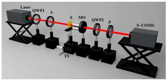 Schematic illustration of the experimental setup. QWP1 and QWP2 represent quarter-wave plates, A is attenuator, S stands for sample, microscope objective lens is denoted by MO, and P is Glan–Thompson polarizer. Laser is He–Ne with an emission wavelength of 632.8 nm, and the S-CMOS camera model is Zyla 5.5.