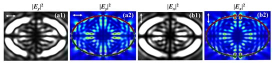 Experimental (a1,b1) and simulation (a2,b2) intensity maps of |Ey|2 under the x-linearly polarized (LP) illumination (a1,a2) and |Ex|2 under the y-LP illumination (b1,b2), respectively.