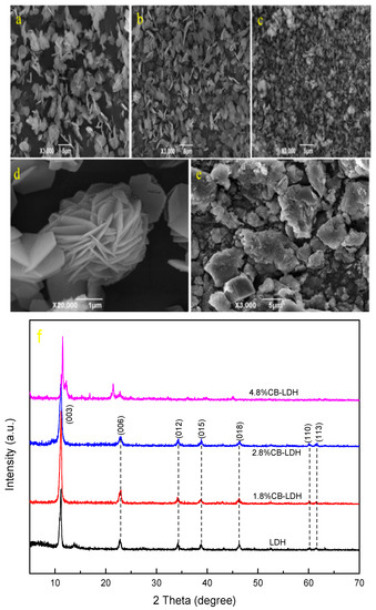 SEM images (a–e) (a = 0%; b = 1.8%; c,d = 2.8%; and e = 3.8%) and XRD patterns (f) of MgAl-LDH (layered double hydroxide) derived from of surfactant solutions of different concentrations.