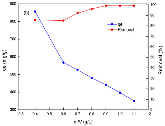 The adsorbent dosage is of great significance to the adsorption process of sulfonated lignite. At an initial SL concentration of 400 mg/L, the effects of the amount of adsorbent when varied from 0.4 to 1.1 g/L were investigated and are summarized in Figure 4b. As the amount of adsorbent increased, the equilibrium adsorption capacity obviously decreased, while the removal efficiency gradually increased. As the adsorbent dose increased from 0.6 to 0.9 g/L, the SL removal efficiency remarkably increased. And due to enough adsorption sites, the SL removal efficiency reached a maximum value of 99.2% when the adsorbent dosage is 1.0 g/L. However, it was found that the removal rate was basically unchanged, even after increasing the amount of adsorbent due to the saturation adsorption of 2.8%CB-0.9MLDH [25]. Therefore, 1.0 g/L was selected as the optimal dosage in the following experiments.