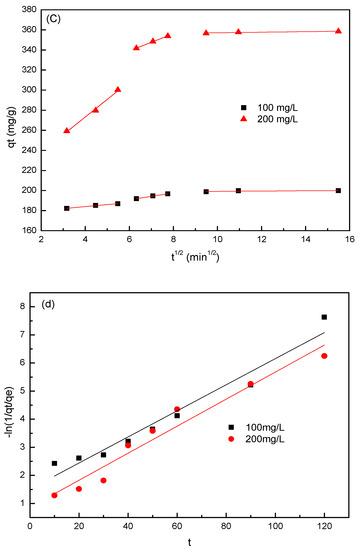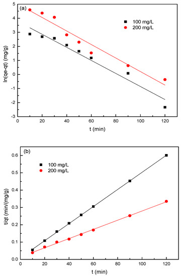 Adsorption kinetics is one of the important factors in evaluating the efficiency of the adsorbent [27]. The effects of contact time on the adsorption property were investigated by performing experiments at different SL concentrations (100 and 200 mg/L) and varying contact times at 25 °C and pH = 7. As shown in Figure 5b, equilibrium time was not affected by all initial SL concentrations, and the approximate equilibrium adsorption could be achieved within 90 min. The adsorption rate was relatively high at the first 15 min due to the availability of abundant adsorption sites on the surface of the adsorbent. After a lapse of time, the remaining vacant adsorption sites were difficult occupy because of the repulsive force between the sulfonated lignite molecules and bulk phases [28], which resulted in a low adsorption rate until the achievement of equilibrium. The absorbed amounts of SL at equilibrium were found to be 199.9 and 358.5 mg/g for initial SL concentrations of 100 and 200 mg/L, respectively. A higher initial SL concentration expanded the effective contact area with the adsorbent, providing the necessary driving force for sulfonated lignite to transcend the mass transfer resistance on the interface [29].