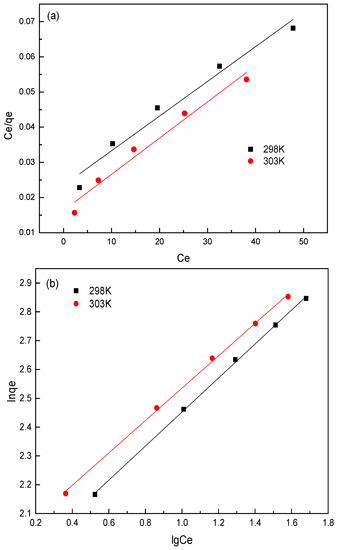 Equilibrium adsorption isotherms are usually used to describe the interaction between the concentration of the adsorbent and the adsorbed amount at a constant temperature [30]. In this work, the adsorption data were further fitted by the well-known Langmuir, Freundlich, and Dubinin–Radushkevich (D–R) models. The fitting isotherms are shown in Figure 7, and the calculated parameters through regression analysis based on experimental data are summarized in Table 3. It was found that the correlation coefficients (R2 > 0.998) of the Freundlich model were higher than those of the Langmuir model (R2 was in the range of 0.963–0.967), which was more qualified to explicated the adsorption process. Therefore, the adsorption of sulfonated lignite on hierarchical MgAl-LDH led to the formation of irregular multilayer adsorption on the outer surface of the adsorbent, which was consistent with the results of Gasser et al. [31]. The values of n (1.6937 and 1.7802 at 298 and 303 K) for best-fit Freundlich model were greater than 1, indicating that the adsorption process of sulfonated lignite proceeded easily. The values of activation energy calculated in the D–R model were 403 and 562.2 J/mol at 298 K and 303 K, which are both less than 8 kJ/mol, indicating that electrostatic gravity is the main force in the adsorption process [32].