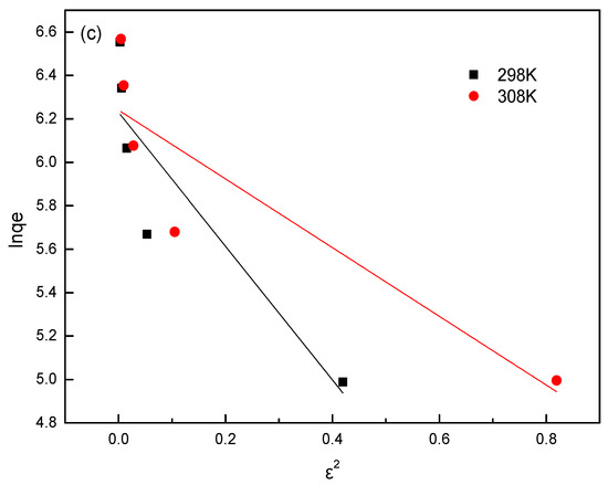 Adsorption isothermal models for adsorption of SL by 2.8%CB-LDH: (a) Langmuir model, (b) Freundlich model, and (c) Dubinin–Radushkevich (D–R) model.