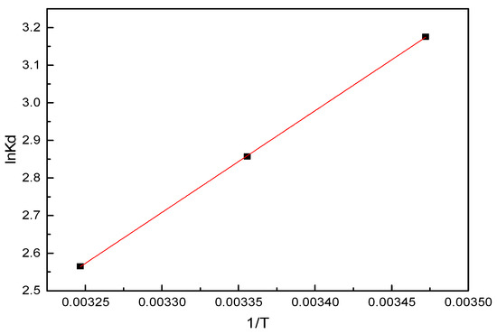 The values of the standard Gibbs free energy change (ΔG) at various temperatures was negative, thus demonstrating the feasibility and spontaneous nature of the adsorption process. It became more negative with decreases in temperature (−7.60, −7.08, and −6.57 kJ/mol at 288, 298, and 308 K, respectively), revealing that the adsorption of sulfonated lignite on hierarchical MgAl-LDH was more effective at lower temperatures [33]. Simultaneously, the values of the standard enthalpy change (ΔH) and the standard entropy change (ΔS) were also negative, which revealed the exothermic nature and decrease in randomness between liquid and solid interfaces during the adsorption process [34]. However, it should also be noted that the entropy of the system and surroundings might have increased because the adsorption reaction was not an isolated process [35].