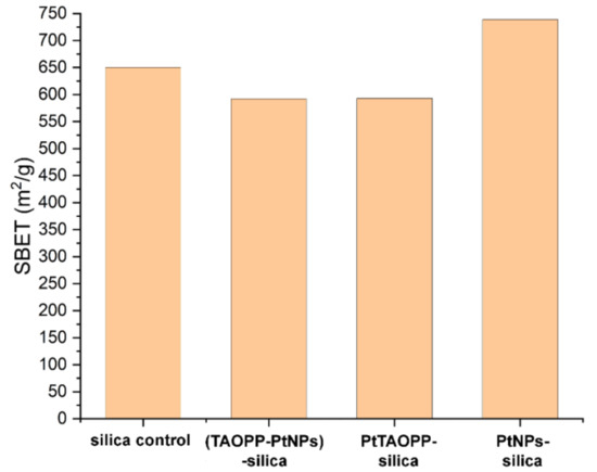 The specific surface area of the adsorbent materials has a deterministic effect on their performance. In order to perform textural characterization of the adsorbent nanomaterials nitrogen porosimetry was employed. All isotherms were type IVa, characteristic to the mesoporous materials [25,34]. The specific surface area evolution was presented in Figure 2. It is interesting to remark that the introduction of the porphyrins inside the silica support causes a 10% decrease of specific surface area while the introduction of the platinum nanoparticles causes a 14% increase. The specific surface areas were between 590–740 m2/g, proper for applications in adsorption processes.