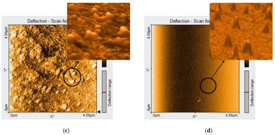 The atomic force microscopy (AFM) images of the hybrid materials were registered on a Nanosurf® EasyScan 2 Advanced Research AFM (Amsterdam, The Netherlands), equipped with a piezoelectric ceramic cantilever, in contact mode, after being drop-casted on silica pure plates. AFM data were quantitative on all three dimensions, the dark colours and their light tones representing the lower and the higher topography.