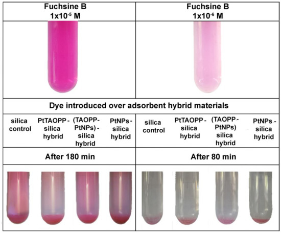 Nevertheless, the adsorption capacities of the silica materials containing porphyrins, namely PtTAOPP-silica hybrid and (TAOPP-PtNPs)-silica hybrid, are very similar and with 15–20% higher than in the case of silica control or silica impregnated only with platinum nanoparticles (Table 2). In addition, lower concentrations than 1 × 10−5 M fuchsine B are completely removed after 80 min, in still waters by all the proposed materials (Figure 6).