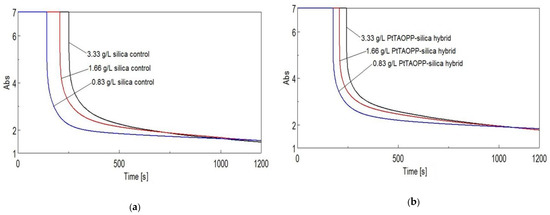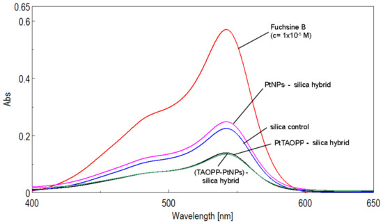The spectra presented in Figure 7 after approximately 150 s reveal a significant decrease in intensity of fuchsine B, meaning that a very fast adsorption process of fuchsine B is taking place on both PtTAOPP–silica material and on silica control. After this period, the adsorption process slows down, although the graphs follow different courses. The final intensities of fuchsine B dye in the solutions have very low values, despite the fact that the initial absorbance intensities exceeded the reading capacity of the apparatus. Due to the fact that the final intensities are negligible, the conclusion is that both materials have the capacity to completely adsorb and remove fuchsine B dye from waste solution, at a concentration of 5 × 10−4 M, in a time interval of 1200 s, that means 58.67 mg fuchsine B/g adsorbent material, in good agreement with the best values mentioned in the literature: 58.8 mg/g in case of using raw pistachio nut shells [37], 58.48 mg/g in case of using HCl-modified malted sorghum mash [38] and 52.57 mg/g in the case of using epichlorohydrin crosslinked peanut husk [10].