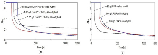 Figure 9a–d shows the variation in time of the amount of fuchsine B dye adsorbed for three different sorbent quantities for each material: silica control (a), PtTAOPP-silica hybrid (b), (TAOPP-PtNPs)-silica hybrid (c) and PtNPs-silica hybrid (d). The best results for all four tested materials, silica control, PtTAOPP-silica hybrid (TAOPP-PtNPs)-silica hybrid and PtNPs-silica hybrid meaning the lower final absorption intensity of the fuchsine B, were obtained for the loading of 3.33 g/L.