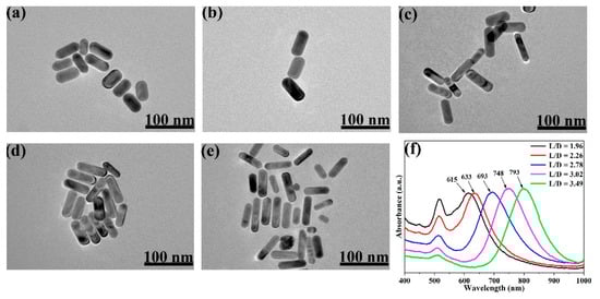 TEM images of Au NRs with different L/Ds are presented in Figure 1a–e. The images clearly show the differences of L/D between these samples and its dependence of the volumes of the added AgNO3 solution.