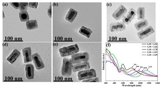TEM images for different length-to-diameter ratios (L/Ds) ((a) 1.96, (b) 2.26, (c) 2.78, (d) 3.02, and (e) 3.49) of the Au NR–mercaptobenzoic acid (MBA)@Cu2O core–shell systems with the same Cu2O shell thicknesses, and (f) UV–VIS–NIR absorption spectra for Au NR–MBA–Cu2O systems with different L/D grown Cu2O shells of consistent thickness (the positions of maximum absorption are 794, 840, 953, 1038, and 1136 nm, respectively).