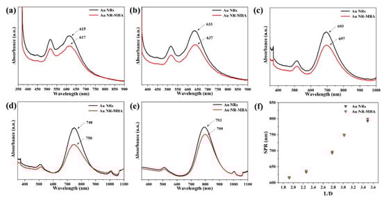 UV–VIS–NIR spectra of the Au NR–MBA assemblies with different Au longitudinal localized surface plasmon resonance (LSPR) absorption bands at (a) 617 nm, (b) 637 nm, (c) 697 nm, (d) 750 nm, and (e) 799 nm. (f) Surface plasmon resonance (SPR) absorption peak position distribution with Au NRs L/D.