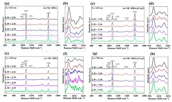 Surface-enhanced Raman scattering (SERS) spectra obtained at (a) 633 nm and (e) 785 nm laser excitations for the MBA in Au NR–MBA assemblies and SERS spectra obtained at (c) 633 nm and (g) 785 nm laser excitations for Au NR–MBA@Cu2O assemblies with the same shell thicknesses. Panels (b), (d), (f), and (h) are expanded views of the 990–1030 cm−1 regions of (a), (c), (e), and (g), respectively.