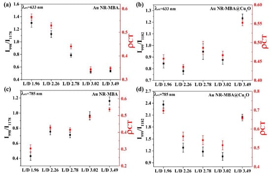 Degree of charge transfer (CT) () in the Au NR–MBA and Au NR–MBA@Cu2O samples and the SERS intensity ratio between the bands at 998 (b2) and 1178 cm−1 (a1) (999 (b2), and 1182 cm−1 (a1) of the Au NR–MBA (Au NR–MBA@Cu2O) assemblies at two laser excitations: (a,b) 633 nm and (c,d) 785 nm.