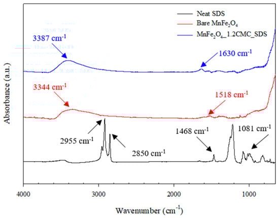 FT-IR spectra of the neat SDS surfactant, bare MnFe2O4, and MnFe2O4_1.2CMC_SDS ferrite nanoparticles.
