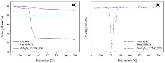 The thermograms (TGA) and derivative thermograms (DTG) of the MnFe2O4 are shown in Figure 2a,b. The SDS thermogram shows a significant weight loss between 180 and 350 °C of about 69.18%, due to the degradation of SDS [40]. The degradation temperature of the SDS surfactant is identified at 212.34 °C from the DTG curve in Figure 2b. The bare MnFe2O4 has a weight loss of 3.66% between 100 and 350 °C from the removal of adsorbed water, whereas the MnFe2O4_1.2CMC_SDS has the weight loss of 4.79% between 60 and 160 °C due to the water evaporation [41]. The thermograms suggest that the ferrite nanoparticles consist of over 95% inorganic phase of the MnFe2O4, and the synthesized MnFe2O4 is of good thermal stability. Furthermore, the MnFe2O4_1.2CMC_SDS has no weight loss related to the SDS surfactant. This confirms that the SDS surfactant was totally removed from the MnFe2O4_1.2CMC_SDS.
