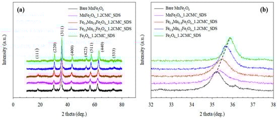 The XRD patterns of the bare MnFe2O4 and Fe(1-x)MnxFe2O4_1.2CMC_SDS, with various Mn2+: Fe2+ molar ratios, where x’s value varies from 1 to 0 (x = 1, 0.6, 0.2, and 0), are shown in Figure 3a. The XRD patterns of the Fe(1−x)MnxFe2O4_1.2CMC_SDS at various Mn2+:Fe2+ molar ratios show the same XRD patterns as the bare MnFe2O4 with the diffraction peaks at the (111), (220), (311), (400), (422), (511), (440), and (533) crystal planes indicating the cubic spinel structure with the Fd3m space group [27,31,39,44]. Furthermore, each pattern does not show the diffraction peaks of other components, which may occur from the oxidation reaction. This confirms that the metal ion precursors (Fe3+, Mn2+, and Fe2+) were completely bounded to the ferrite nanoparticles [27].