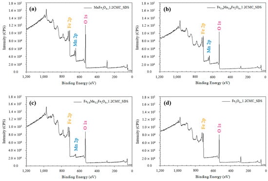 XPS spectra of the synthesized Fe(1-x)MnxFe2O4_1.2CMC_SDS ferrite nanoparticles: (a) MnFe2O4_1.2CMC_SDS, (b) Fe0.4Mn0.6Fe2O4_1.2CMC_SDS, (c) Fe0.8Mn0.2Fe2O4_1.2CMC_SDS, and (d) Fe3O4_1.2CMC_SDS.