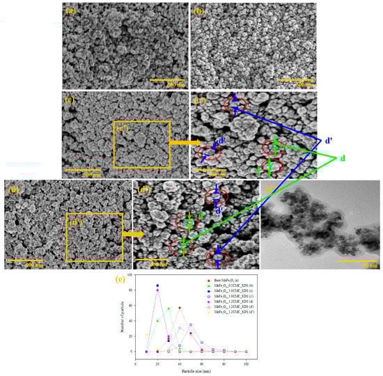 SEM and TEM images of the synthesized MnFe2O4 ferrite nanoparticles at various SDS surfactant concentrations: (a) SEM image of bare MnFe2O4, (b) SEM image of MnFe2O4_0.5CMC_SDS, (c) SEM image of MnFe2O4_1.0CMC_SDS, (c’) inset SEM image of (c) MnFe2O4_1.0CMC_SDS, (d) SEM image of MnFe2O4_1.2CMC_SDS, (d’) inset SEM image of (d) MnFe2O4_1.2CMC_SDS, (d″) TEM image of MnFe2O4_1.2CMC_SDS, and (e) the particle size distributions.