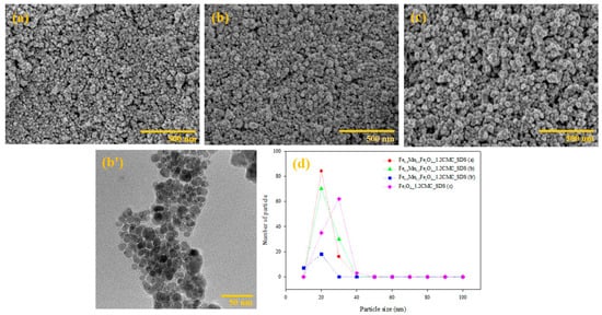 SEM and TEM images of the synthesized Fe(1−x)MnxFe2O4_1.2CMC_SDS ferrite nanoparticles: (a) SEM image of Fe0.4Mn0.6Fe2O4_1.2CMC_SDS, (b) SEM image of Fe0.8Mn0.2Fe2O4_1.2CMC_SDS, (b’) TEM image of Fe0.8Mn0.2Fe2O4_1.2CMC_SDS, (c) SEM image of Fe3O4_1.2CMC_SDS, and (d) the particle size distributions.