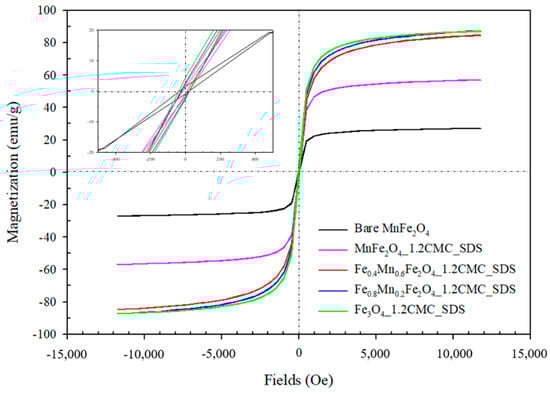 The magnetic properties of magnetic materials are known to depend on the structure, size, shape, and composition [58]. The magnetization versus magnetic field plots (M-H hysteresis loop) provide the magnetism behavior as well as the values of saturation magnetization (Ms), coercivity (Hc), and remanent magnetization (Mr). The magnetic properties of the bare MnFe2O4 and Fe(1-x)MnxFe2O4_1.2CMC_SDS are shown in Figure 7 and tabulated in Table 2. All hysteresis loops of the ferrite nanoparticles are quite narrow with small amounts of energy dissipated, thus exhibiting the soft ferromagnetic behavior at room temperature, as also suggested by the inset plots of Figure 7, Figures S3 and S4 [21,58,59]. Moreover, the small Hc could imply that the energy barriers are larger than the thermal, energy and hence the magnetic moments will be blocked in the parallel or anti-parallel directions, resulting in the small hysteresis loop (not superparamagnetic). When the energy barriers are smaller than the thermal energy, the energy barriers are overcome and the rotation of the magnetic moments becomes spontaneous under applied the magnetic field, resulting in the non-hysteresis loop (superparamagnetic).