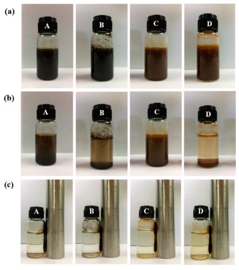 Dispersion property of the synthesized bare MnFe2O4 (A), MnFe2O4 _1.2CMC_SDS (B), Fe0.8Mn0.2Fe2O4_1.2CMC_SDS (C), Fe3O4_1.2CMC_SDS ferrite nanoparticles (D): (a) after ultrasonication; (b) 15 min; (c) under applied an external magnetic field.