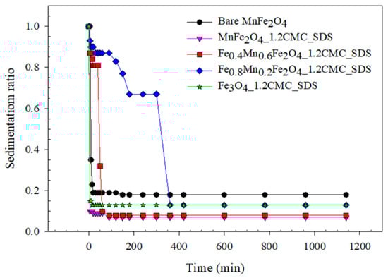 All ferrite nanoparticles can be separated from the water by using an external magnetic field. The sedimentation ratios of the bare MnFe2O4 and Fe(1−x)MnxFe2O4_1.2CMC_SDS ferrite nanoparticles were calculated from the heights of the precipitates divided by the initial heights as a function of time, as shown in Figure 9. The results support the dispersion stability results of magnetic nanoparticles in Figure 8. The dispersions of the bare MnFe2O4, MnFe2O4_1.2CMC_SDS, and Fe3O4_1.2CMC_SDS ferrite nanoparticles are relatively poor as the sedimentation ratios drop close to zero within a short time, whereas the Fe0.8Mn0.2Fe2O4_1.2CMC_SDS ferrite nanoparticle can be dispersed in water for a period of 360 min. Surfactants, polymeric compounds, organic materials, or inorganic materials have been commonly used to improve the dispersion stability of magnetic materials [67,68]. Petcharoen et al. used two fatty acids (oleic acid (OA) and hexanoic acid (HA)) as coating agents for the synthesized magnetite nanoparticles; they illustrated that the oleic acid-coated magnetite nanoparticle was more stable for a longer period of time in the water than the hexanoic acid and bare samples [43].