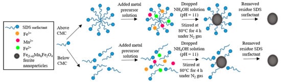 Schematic of Fe(1−x)MnxFe2O4 ferrite nanoparticle synthesis at various SDS surfactant concentrations.